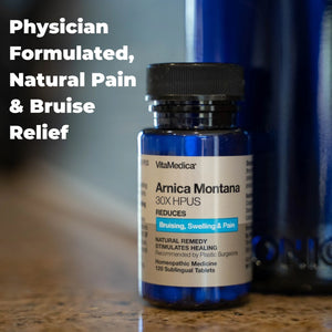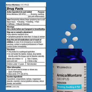 Arnica Montana 30X HPUS Rapid Dissolve Tablets target bruising and swelling, with homeopathic potency suitable for mild to moderate bruising on the face, neck, and body.